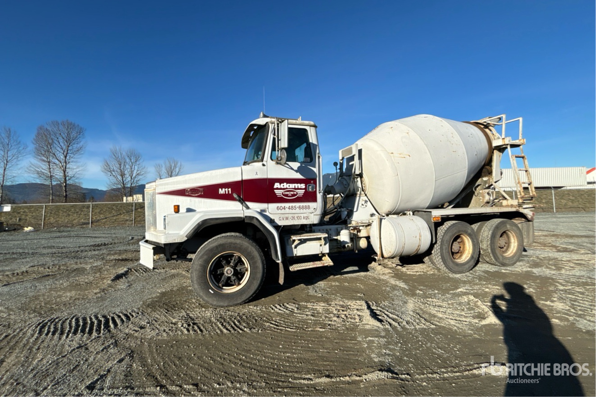 Cummins L10 6 Cylinder 10 L Diesel 280 hp Engine, 2135 Engine hrs, Eaton Fuller 8LL Manual Transmission, 8163 kg Front Axle, 17234 kg Rears, 25397 kg GVWR, 385/65R22.5 Front Tires, 11R22.5 Rear Tires, Hendrickson Rubber over Walking Beam Suspension, 202 in Wheelbase, PTO, London Mixer Unit, 3 Removable Chutes, Remote Control w/Cord
