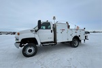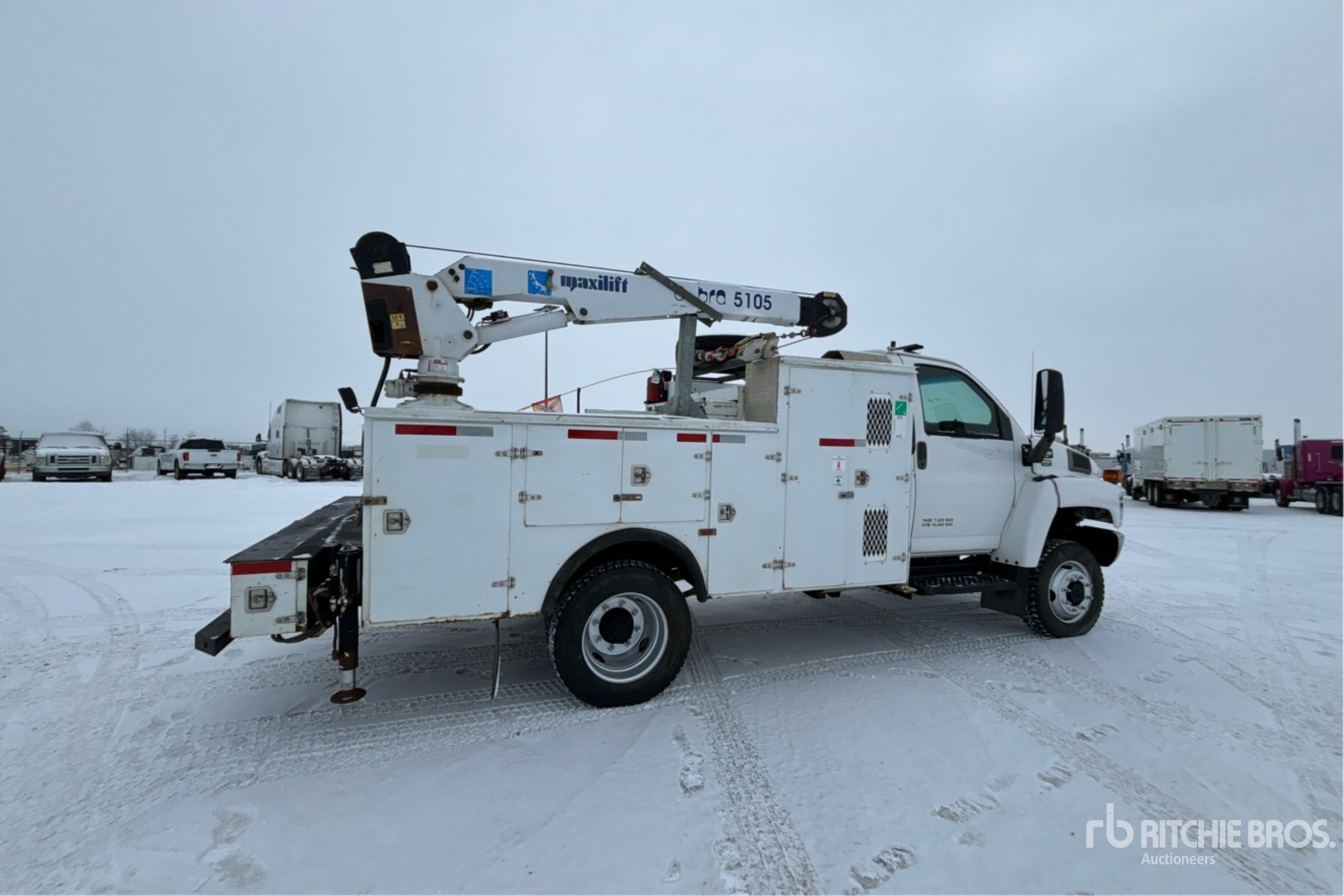 Located in Lane 41 Spot 7, GM Duramax V8 6.6 L Diesel Engine, 2006 US EPA Label, CARB Compliant, 2803 Engine hrs, Exhaust Brake, Automatic Transmission, 8000 lb Front Axle, 13500 lb Rears, 19500 lb GVWR, 245/70R19.5, Spring Suspension, 151 in Wheelbase, 13 ft Body, Hydraulic Stabilizers, Cobra 5105 3 Section Hydraulic Crane, Wired Remote Control, Air Hose Reel