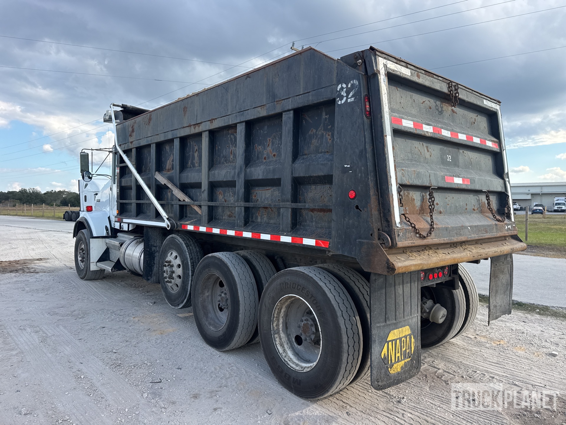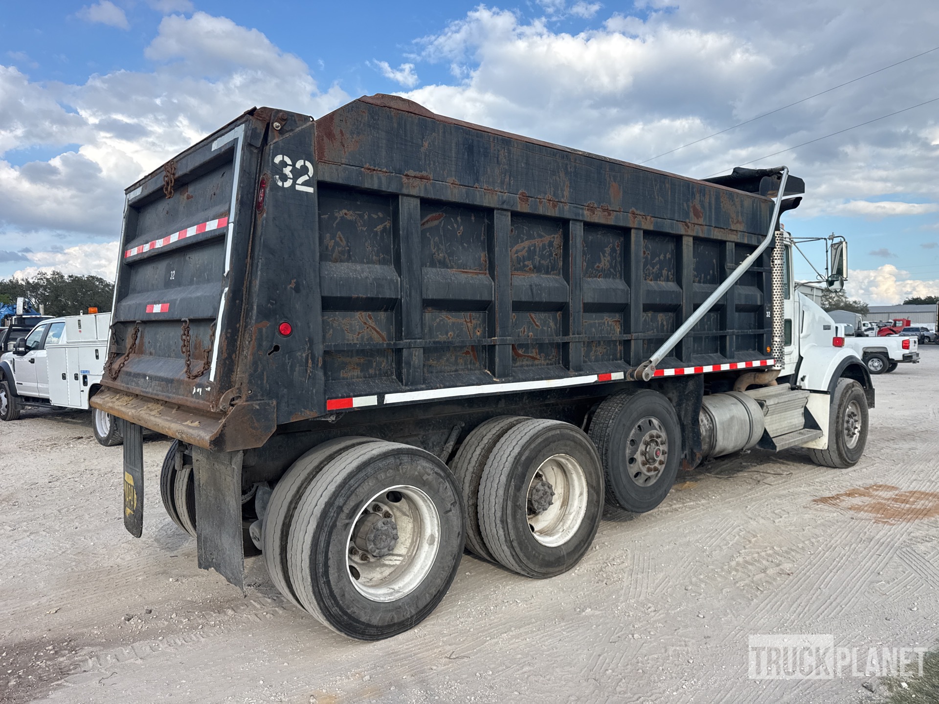 Cummins ISX 6 Cylinder Diesel Engine, 3352 Engine hrs, Engine Brake, Eaton Fuller 13-Speed Manual Transmission, 20000 lb Front Axle, 46000 lb Rears, 4.56:1 Axle Ratio, 66000 lb GVWR, Aluminum Front Wheels, 425/65R22.5 Front Tires, 11R24.5 Rear Tires, Air Lift Pusher Axle, Dual Steering Boxes, Double Frame, Rubber over Walking Beam Suspension, 240 in Wheelbase, PTO, 18 ft Long x 5 ft 6 in High Body, Electric Roll Tarp