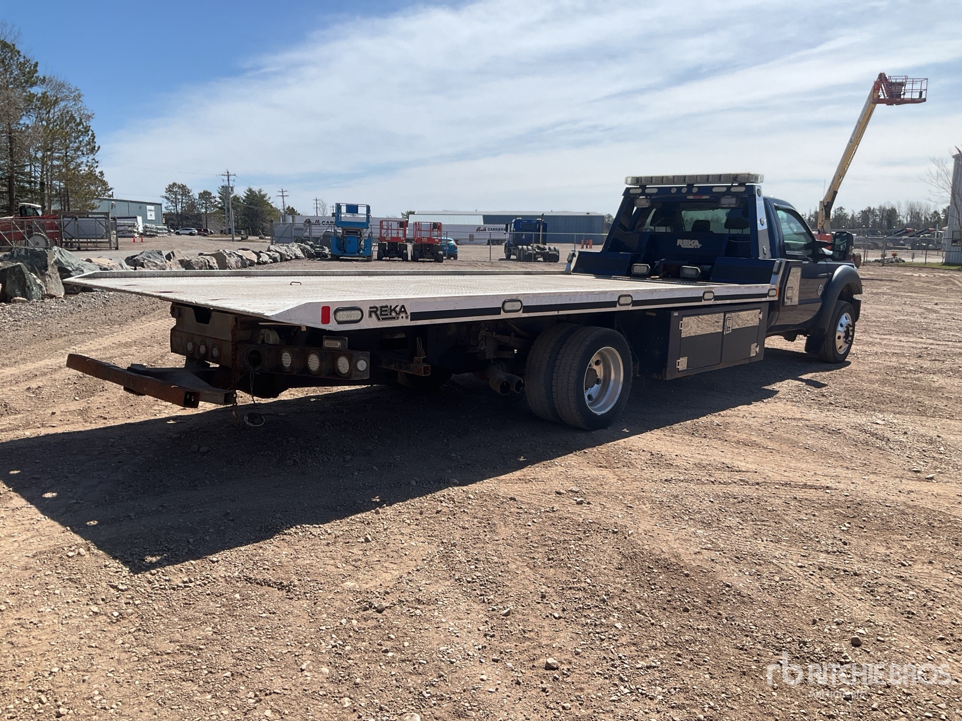 Located in Lane 5 Spot 3, Powerstroke V8 6.7 L Diesel Engine, 2011 US EPA Label, CARB Compliant, Automatic Transmission, 7000 lb Front Axle, 14706 lb Rears, 19500 lb GVWR, Aluminum Outer Wheels, 225/70R19.5, Spring Suspension, 212 in Wheelbase, PTO, Reka Rollback Body, 18 ft 6 in x 100 in Bed, Aluminum Frame, Ramsey Winch, Hydraulic Wheel Lift