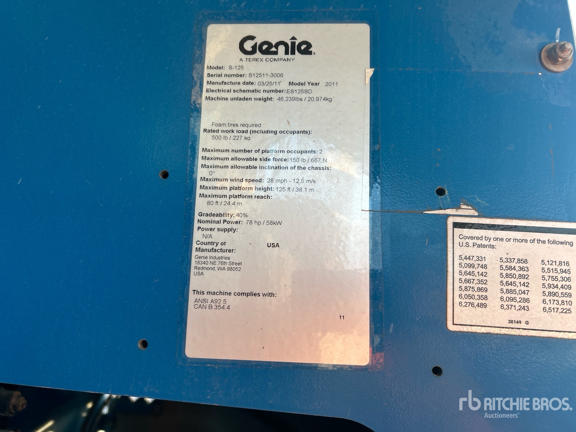 125 ft Max Platform Height, 500 lb Max Weight Capacity, Jib, Power to Platform, Onboard Generator, 2010 US EPA Label, Deutz TD2011L04I 4 Cylinder 74 hp 3.6 L Diesel Engine, 445/65D22.5 Tires