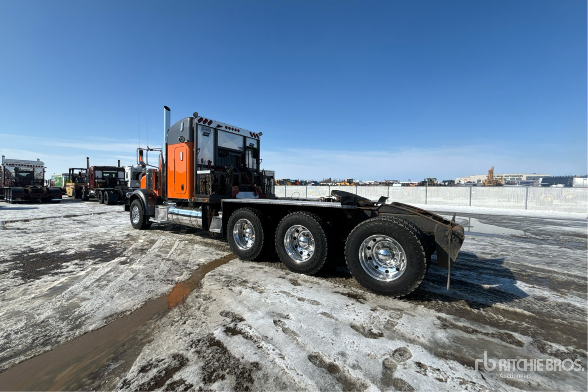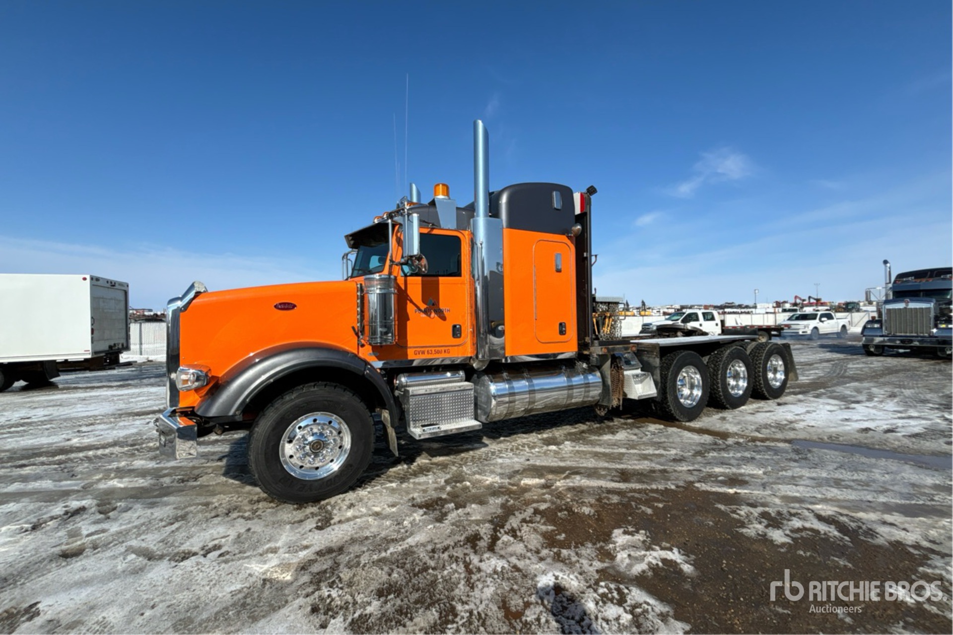 Cummins ISX15 6 Cylinder 15 L Diesel 550 hp Engine, 2011 US EPA Label, Positive Air Shutoff, 9712 Engine hrs, Engine Brake, Eaton Fuller 18-Speed Manual Transmission, Double Differential Locks, 18000 lb Front Axle, 60660 lb Rears, 78660 lb GVWR, Air Ride Cab, 48 in Mid Roof Sleeper Cab, Aluminum Wheels, 385/65R22.5 Front Tires, 11R24.5 Rear Tires, Dual Steering Boxes, Double Frame, Air Trac Air Ride Suspension, 266 in Wheelbase, PTO, Tail Roll, Tulsa Rufnek Intelliguard Winch, Lowboy Ramps