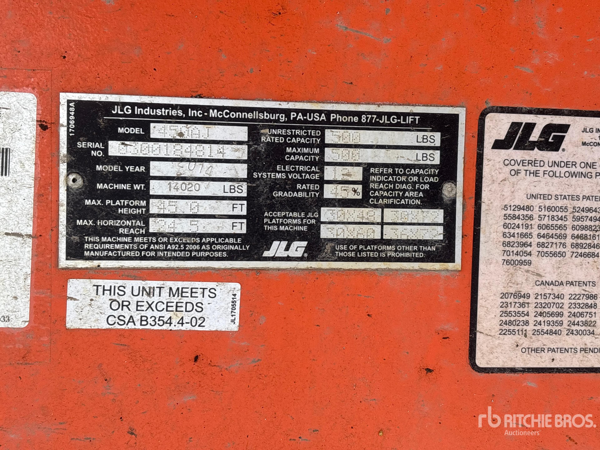 45 ft Max Platform Height, 500 lb Max Weight Capacity, Jib, Power to Platform, 4 Cylinder Diesel Engine, 33x15.50-16.5 NHS Tires