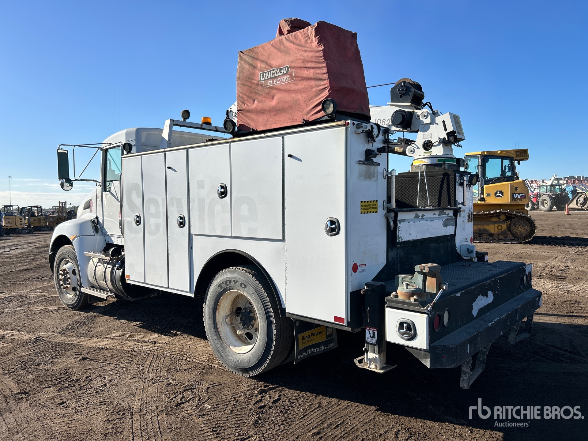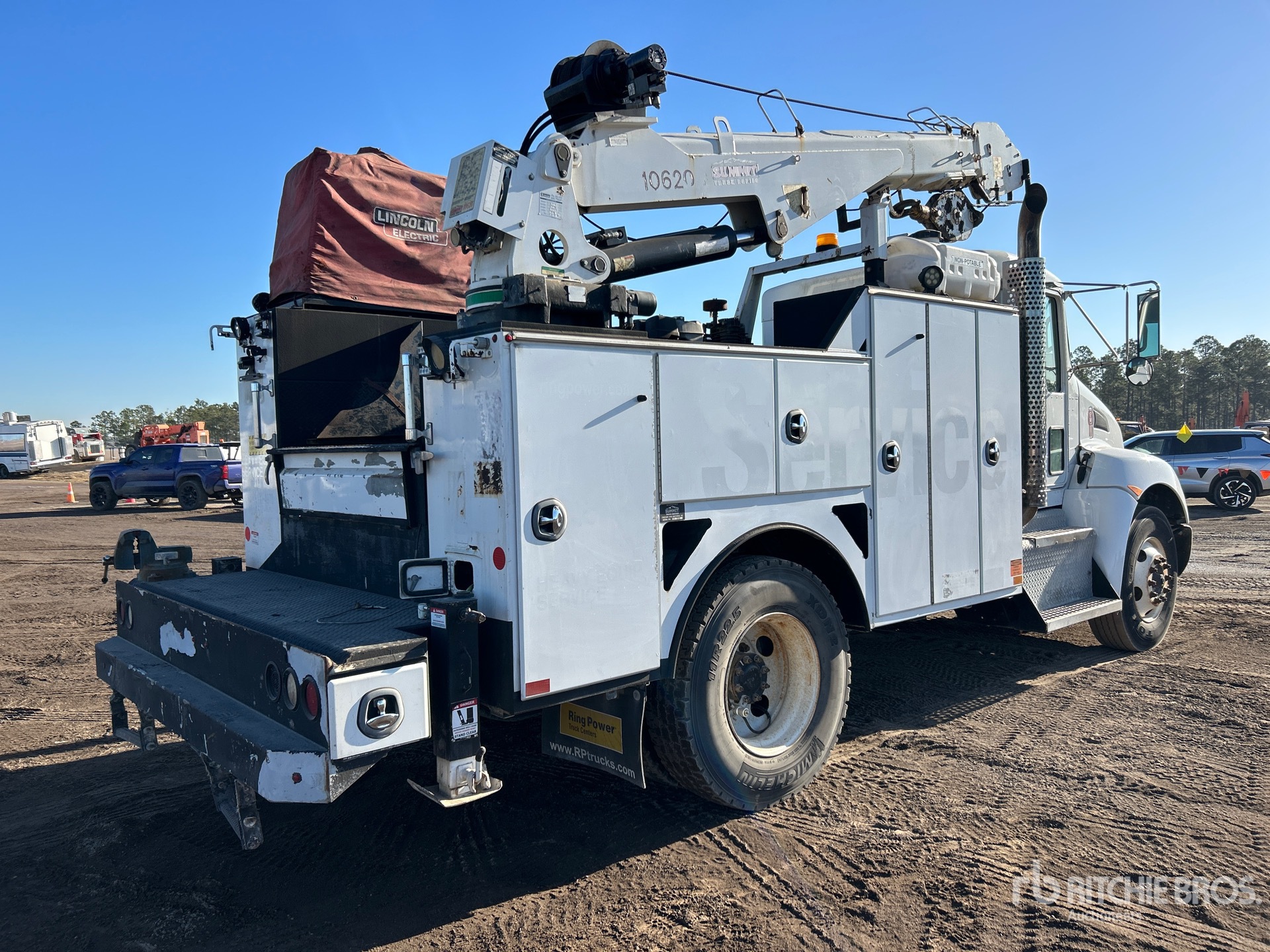 Located in Lane 208 Spot 000, Paccar PX-9 6 Cylinder 8.9 L Diesel 300 hp Engine, 2013 US EPA Label, CARB Compliant, Requires Diesel Exhaust Fluid, 13209 Engine hrs, Engine Brake, Allison 3000RDS 6-Speed Automated Transmission, Differential Lock, 12000 lb Front Axle, 21000 lb Rears, 33000 lb GVWR, 11R22.5, Spring Suspension, 162 in Wheelbase, PTO, Summit 13 ft Body, Manual Stabilizers, Summit 10620 Series B 10000 lb 3 Section Hydraulic Crane, Belaire Gasoline Air Compressor, Air Hose Reel, Lincoln Ranger 305G Gasoline Welder