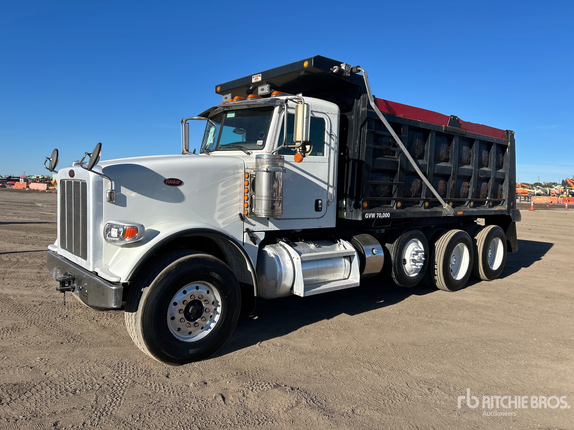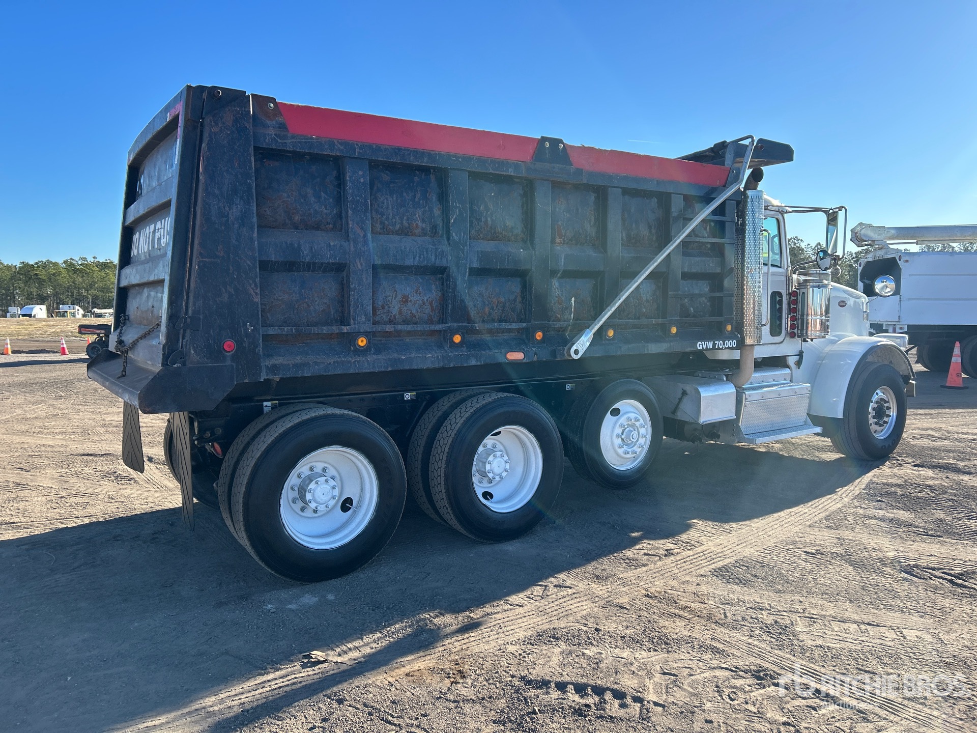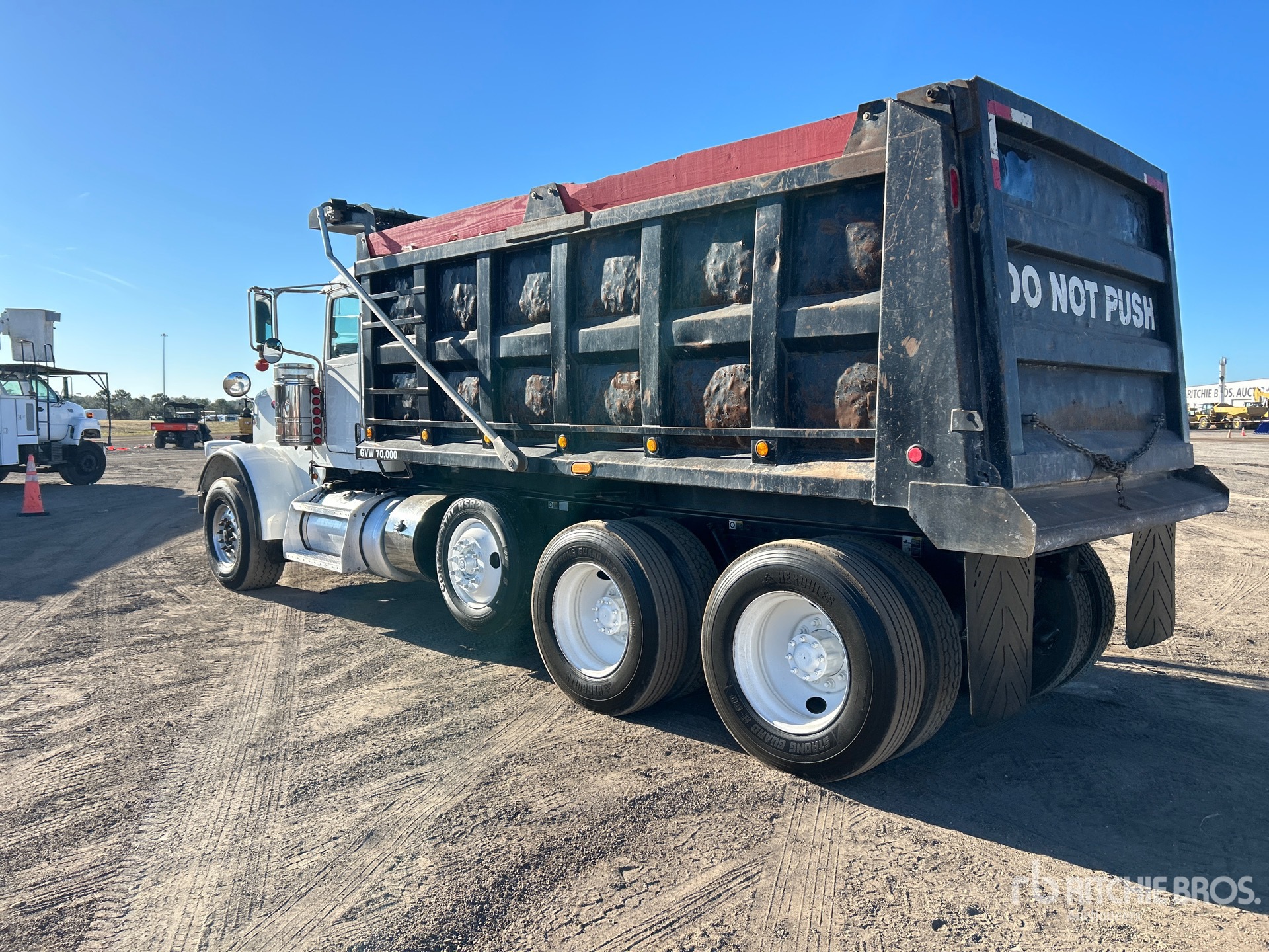 Cummins ISX12 11.9 L Diesel 425 hp Engine, 2013 US EPA Label, Engine Brake, Eaton Fuller 15-Speed Manual Transmission, 20000 lb Front Axle, 46000 lb Rears, 70000 lb GVWR, Aluminum Front Wheels, 425/65R22.5 Front Tires, 11R24.5 Rear Tires, Steerable Air Lift Pusher Axle, Dual Steering Boxes, Double Frame, Chalmers Rubber over Walking Beam Suspension, 234 in Wheelbase, OX Bodies 16 ft Long x 5 ft High Steel Body, Electric Roll Tarp