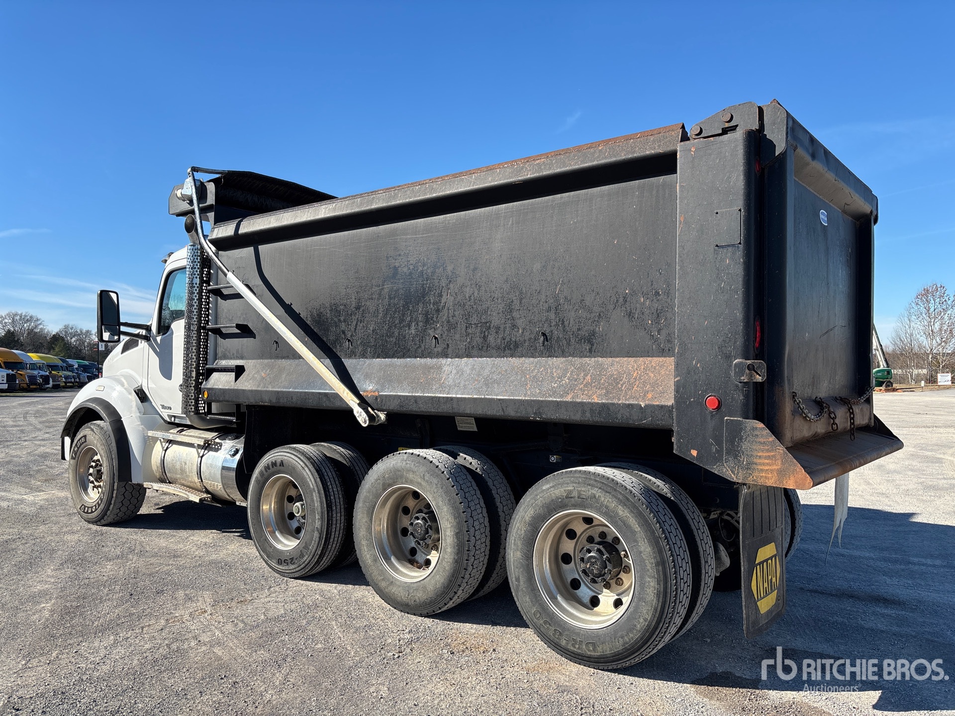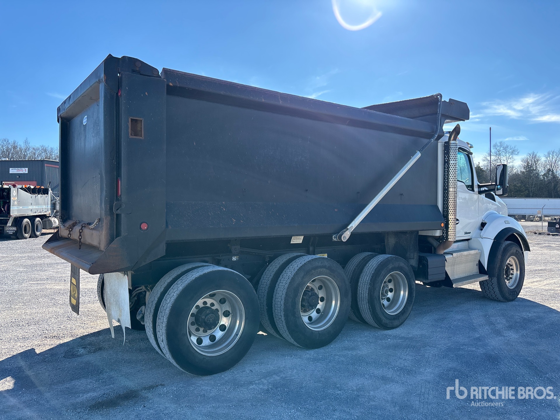 Cummins ISX15 6 Cylinder 15 L Diesel 485 hp Engine, 2015 US EPA Label, Requires Diesel Exhaust Fluid, 18768 Engine hrs, Engine Brake, Allison 4500 6-Speed Automatic Transmission, 20000 lb Front Axle, 68500 lb Rears, 88500 lb GVWR, Aluminum Outer Wheels, 425/65R22.5 Front Tires, 11R24.5 Rear Tires, Air Lift Pusher Axle, Chalmers Suspension, 210 in Wheelbase, PTO, 16 ft Long x 5 ft High Steel Body, Electric Roll Tarp