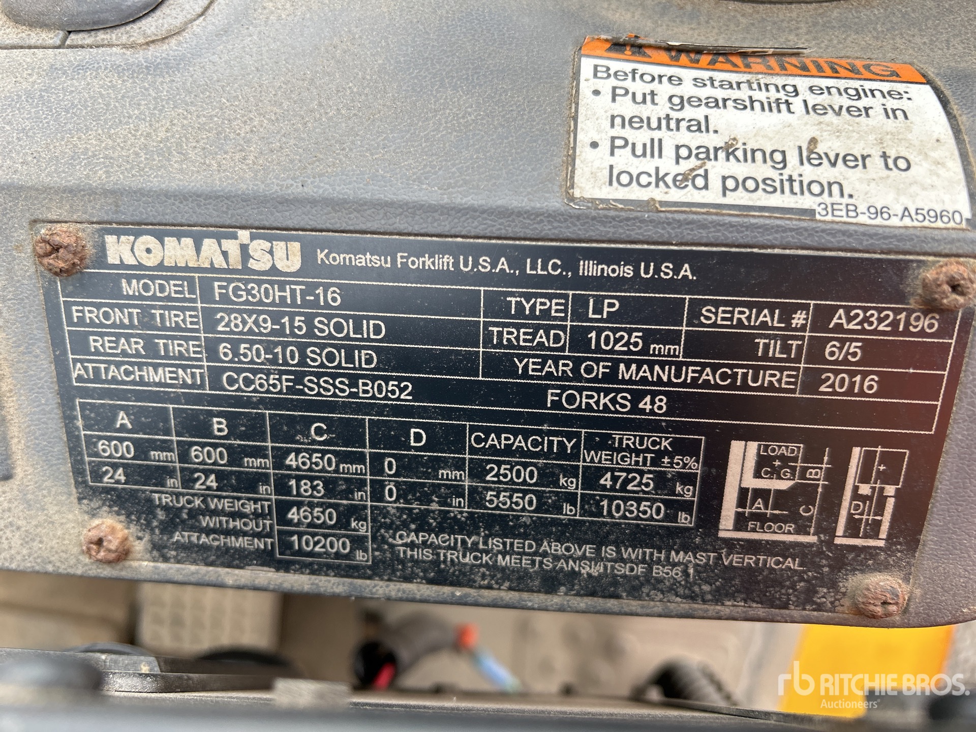 The detailed equipment information is limited in scope, and Ritchie Bros. Auctioneers has not inspected any aspects or components of the equipment other than those expressly set forth herein. Unless expressly stated, we make no representations or warranties, express or implied, concerning the equipment or its components, including without limitation any representations or warranties concerning functionality, conformity or compliance with any safety standard or requirement of any applicable authority or regulatory body, fitness for any particular purpose, or merchantability. You are strongly advised to perform your own detailed inspection of the equipment prior to bidding.