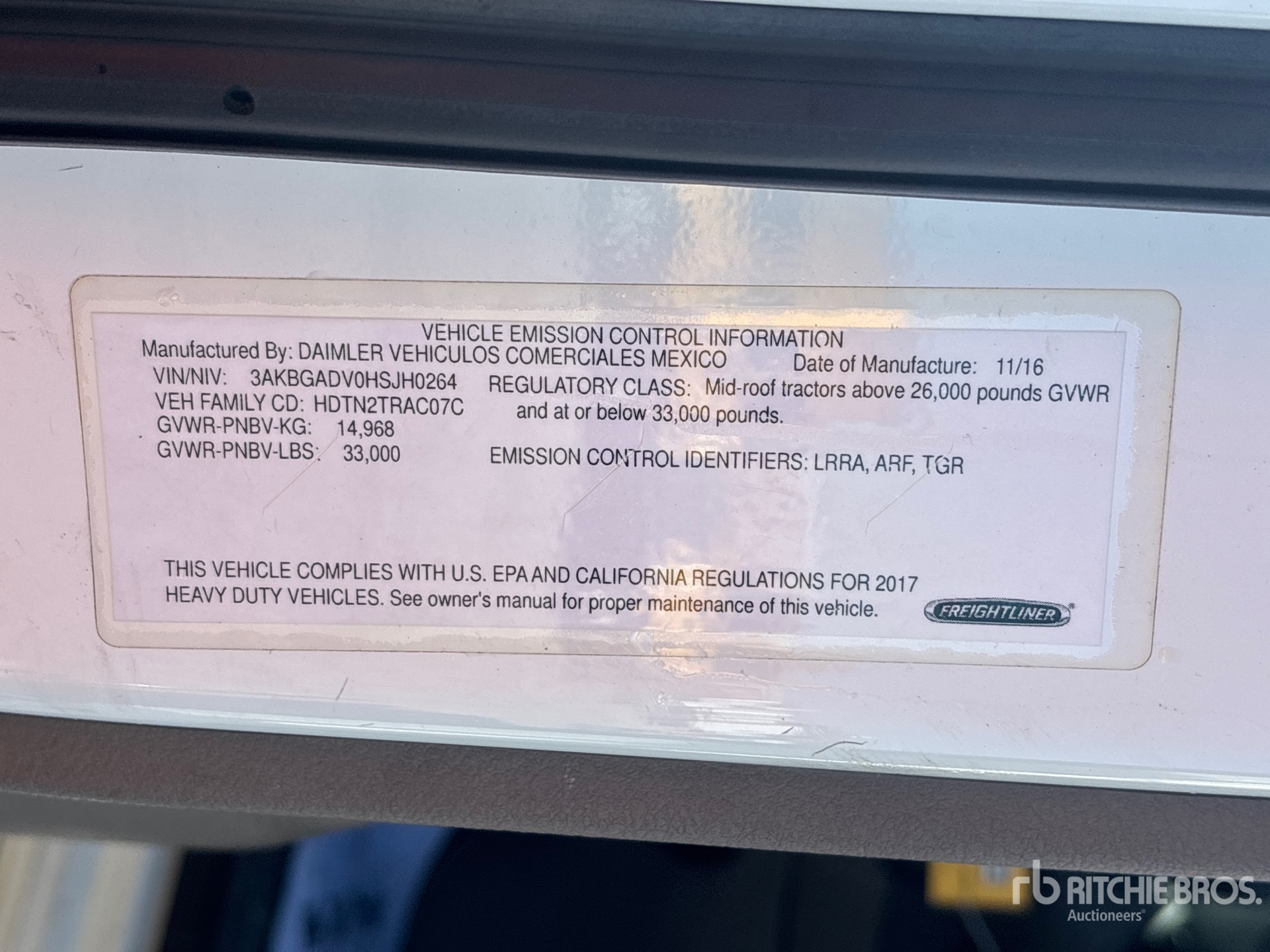 Detroit DD13 435 hp Engine, 2016 US EPA Label, 13621 Engine hrs, Detroit DT12-OB-1550 12-Speed Automated Transmission, 12000 lb Front Axle, 21000 lb Rears, 33000 lb GVWR, Engine Brake, 168 in Wheelbase, Air Suspension, Aluminum Wheels, 11R22.5, Dual Fuel Tanks