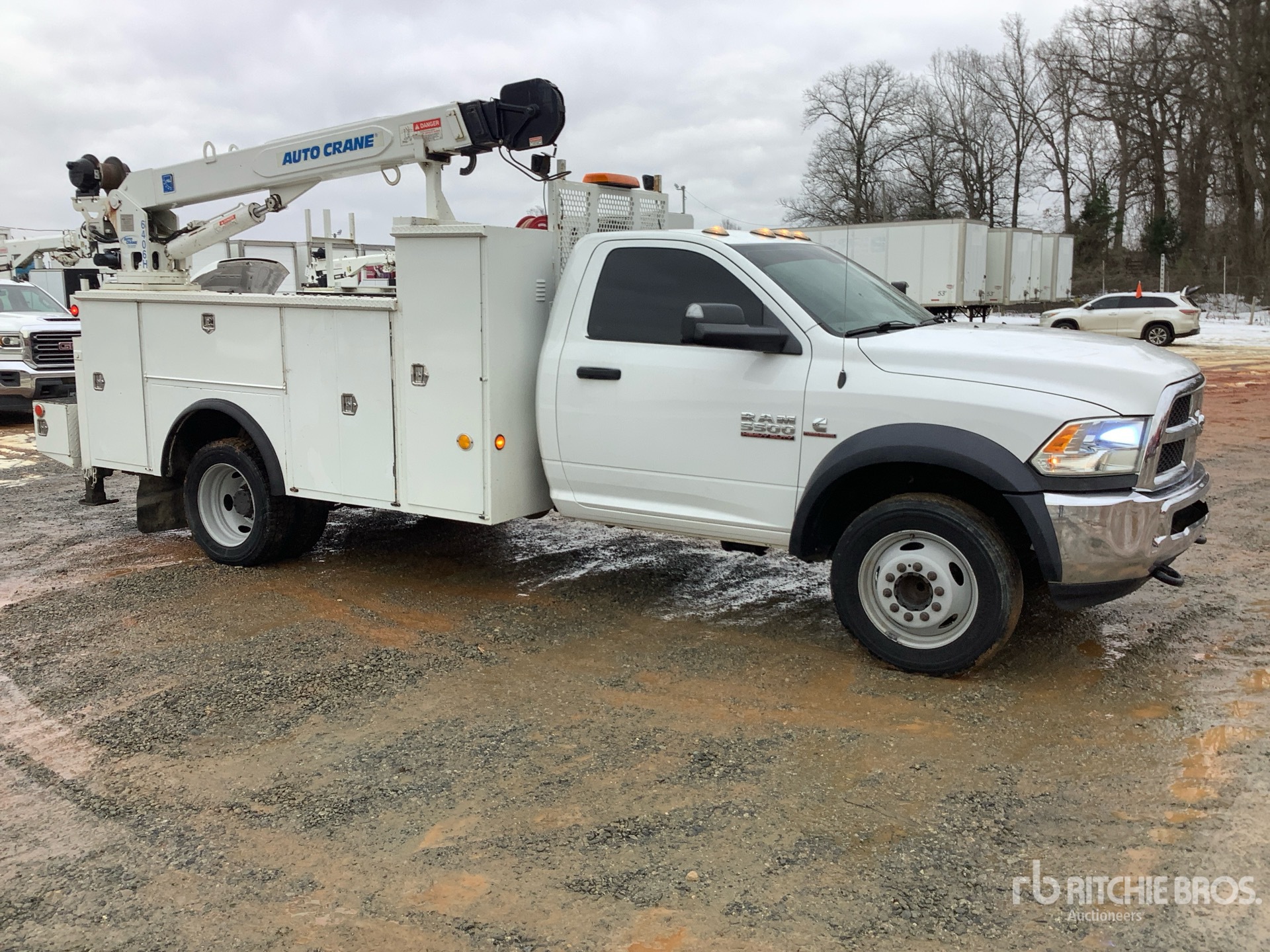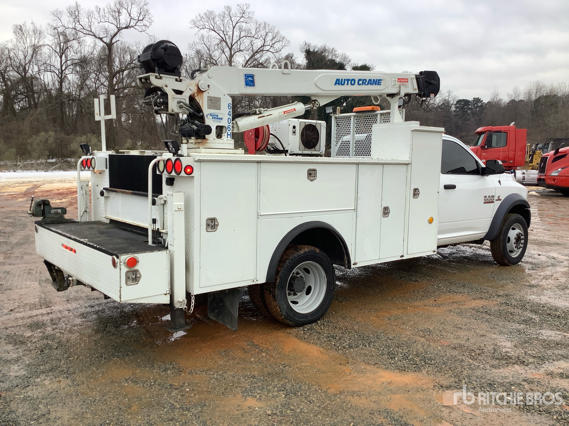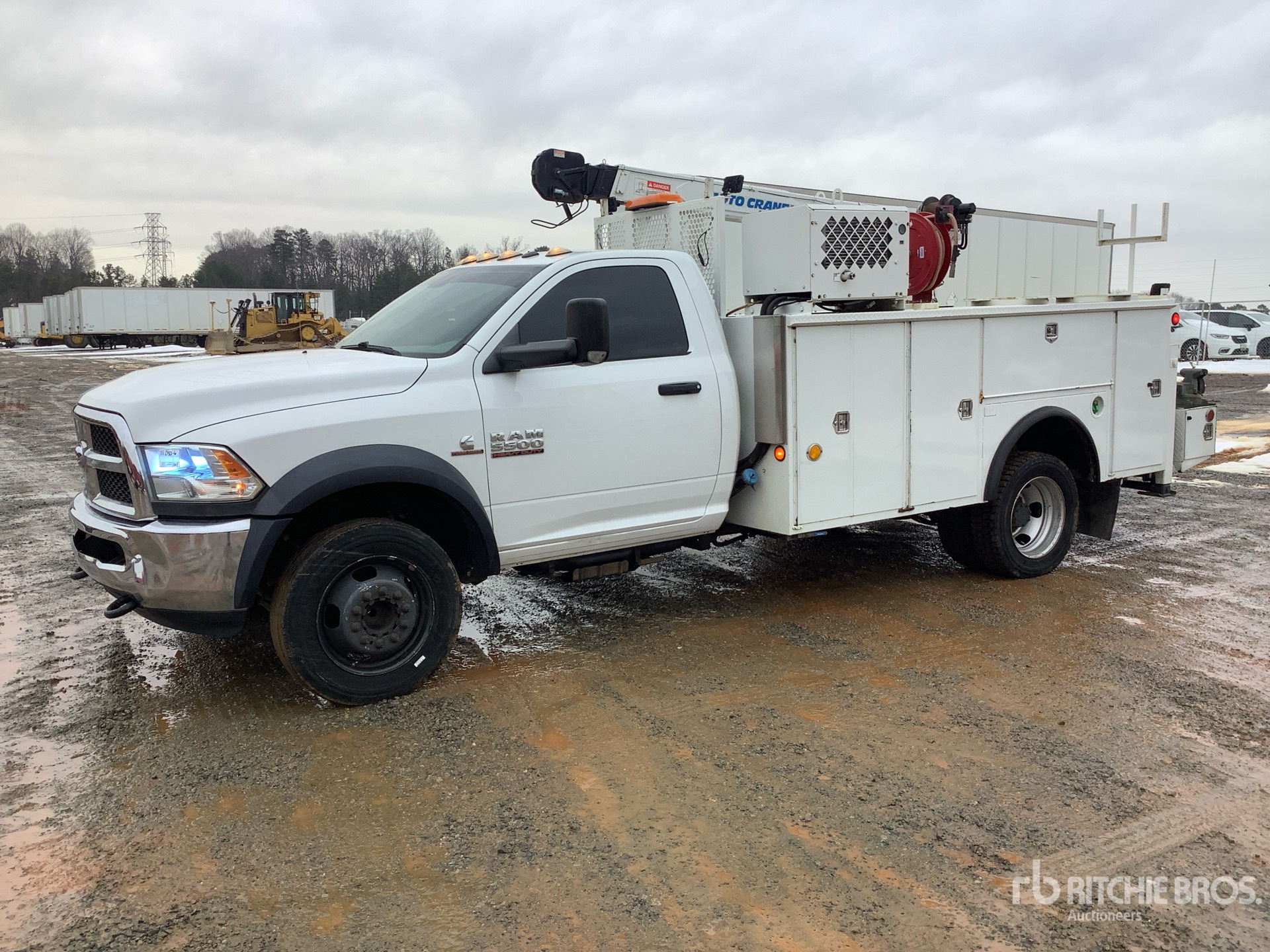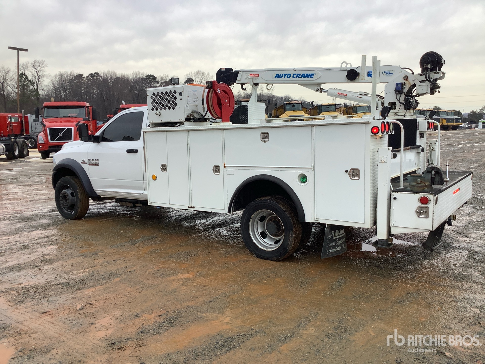 Cummins 6 Cylinder 6.7 L Diesel Engine, 2017 US EPA Label, Requires Diesel Exhaust Fluid, 1728 Engine hrs, Automatic Transmission, 7000 lb Front Axle, 13500 lb Rears, 19500 lb GVWR, 225/70R19.5 Front Tires, 225/70R19.5 Rear Tires, Spring Suspension, 168 in Wheelbase, PTO, Adkins 11 ft Body, Hydraulic Stabilizers, Auto Crane 3 Section Hydraulic Crane, Wireless Remote Control, Vhp40rmh Hydraulic Air Compressor, Air Hose Reel