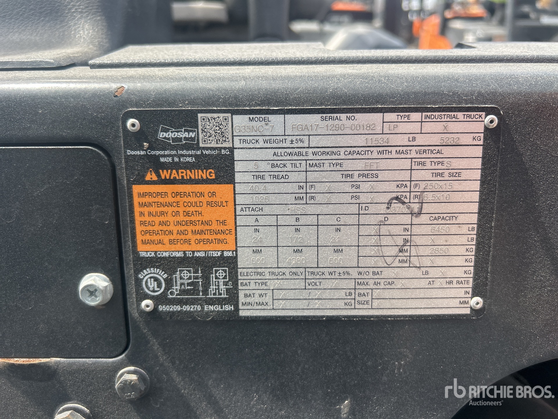The detailed equipment information is limited in scope, and Ritchie Bros. Auctioneers has not inspected any aspects or components of the equipment other than those expressly set forth herein. Unless expressly stated, we make no representations or warranties, express or implied, concerning the equipment or its components, including without limitation any representations or warranties concerning functionality, conformity or compliance with any safety standard or requirement of any applicable authority or regulatory body, fitness for any particular purpose, or merchantability. You are strongly advised to perform your own detailed inspection of the equipment prior to bidding.