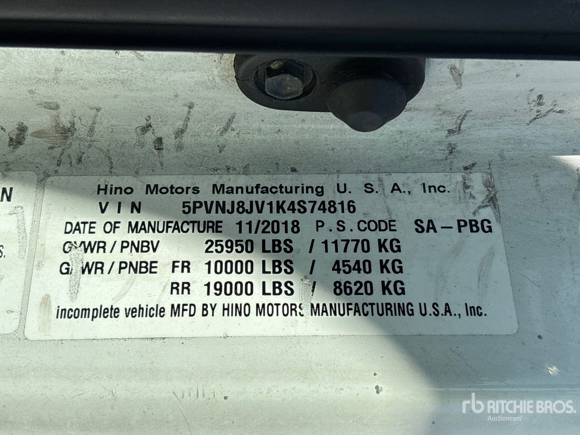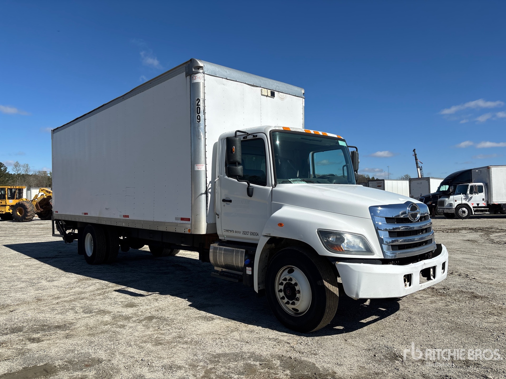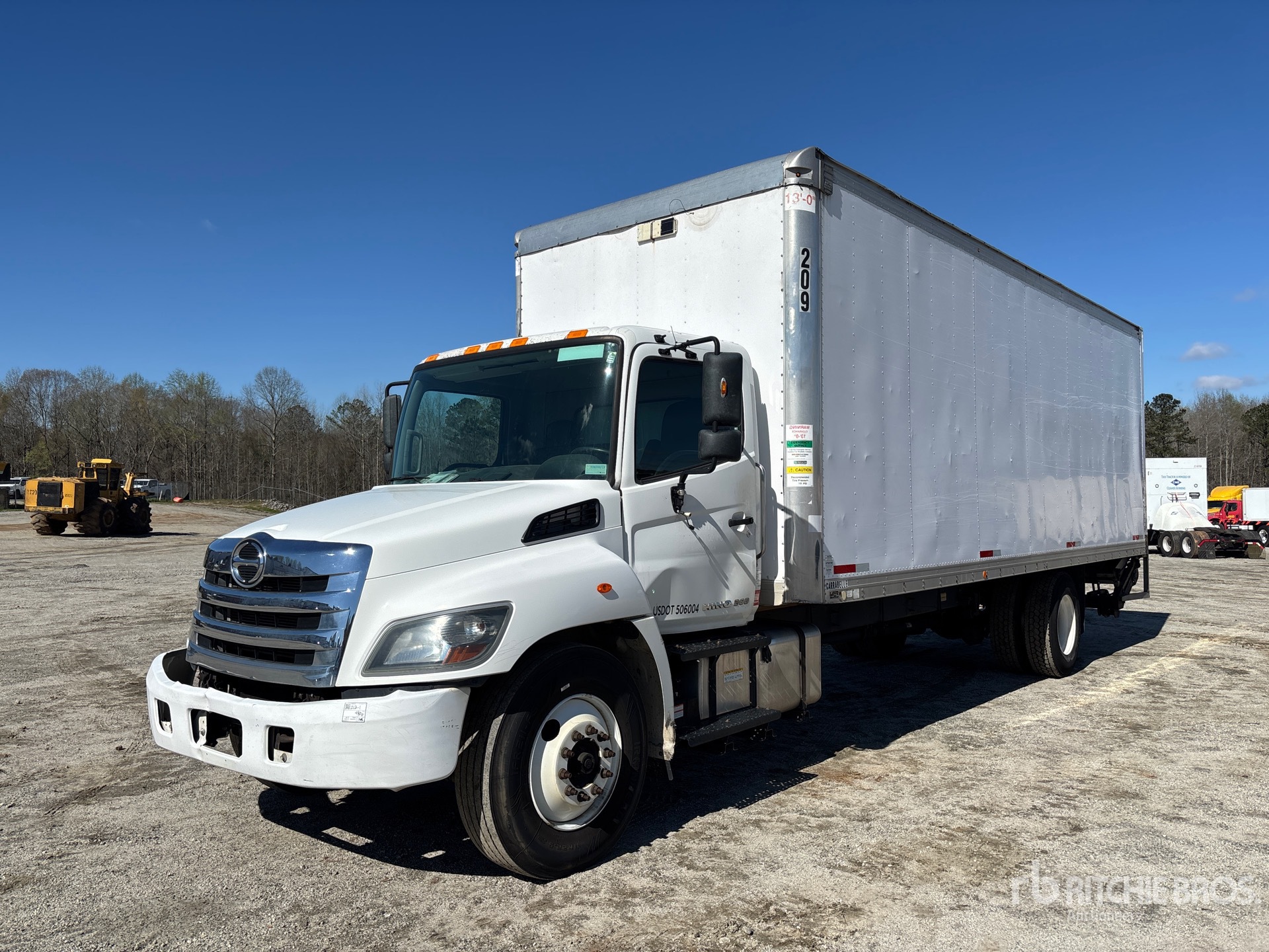 Hino J08E-VB 6 Cylinder 7.6 L Diesel 260 hp Engine, 2018 US EPA Label, Requires Diesel Exhaust Fluid, Automatic Transmission, 10000 lb Front Axle, 19000 lb Rears, 25950 lb GVWR, 11R22.5, Spring Suspension, 272 in Wheelbase, Mickey 26 ft x 102 in Wide x 103 in High Body, Liftgate