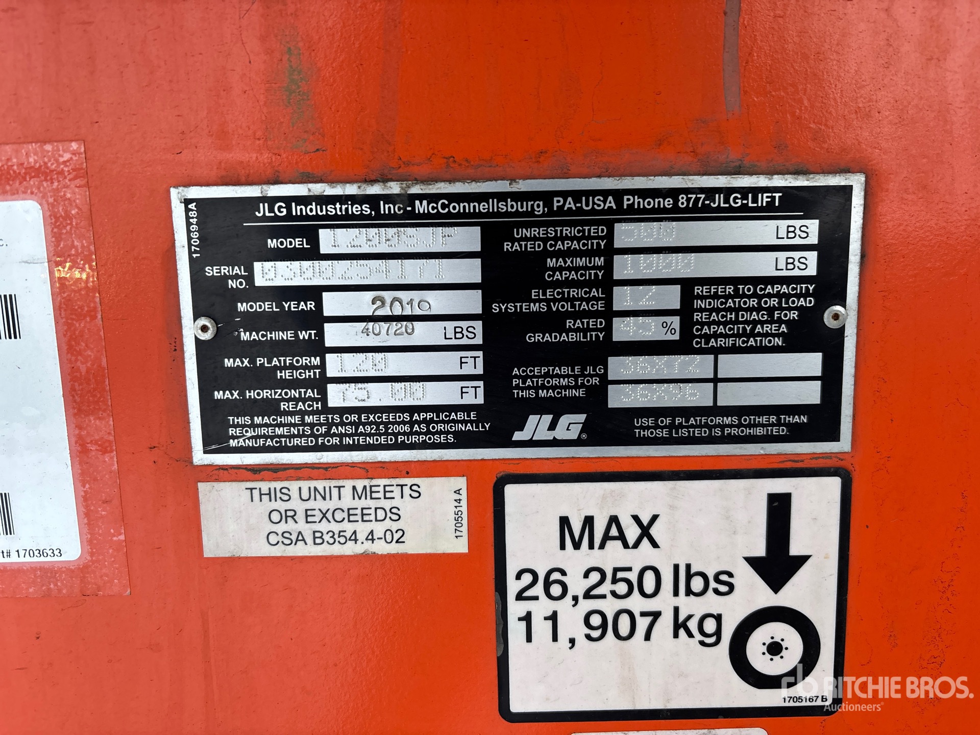 120 ft Max Platform Height, 1000 lb Max Weight Capacity, Jib, Extendable Axles, Power to Platform, Deutz 4 Cylinder Diesel Engine, 445/50D710 Tires