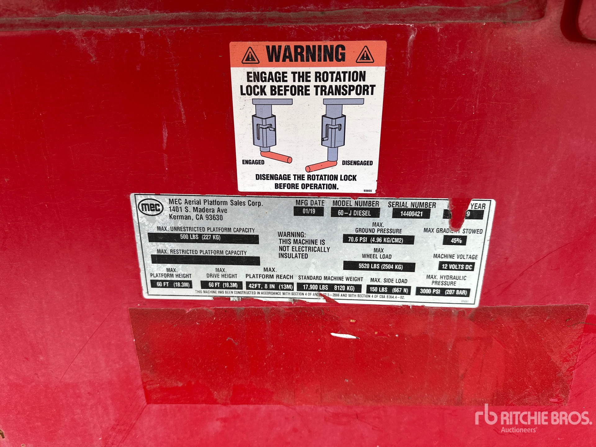 The detailed equipment information is limited in scope, and Ritchie Bros. Auctioneers has not inspected any aspects or components of the equipment other than those expressly set forth herein. Unless expressly stated, we make no representations or warranties, express or implied, concerning the equipment or its components, including without limitation any representations or warranties concerning functionality, conformity or compliance with any safety standard or requirement of any applicable authority or regulatory body, fitness for any particular purpose, or merchantability. You are strongly advised to perform your own detailed inspection of the equipment prior to bidding.