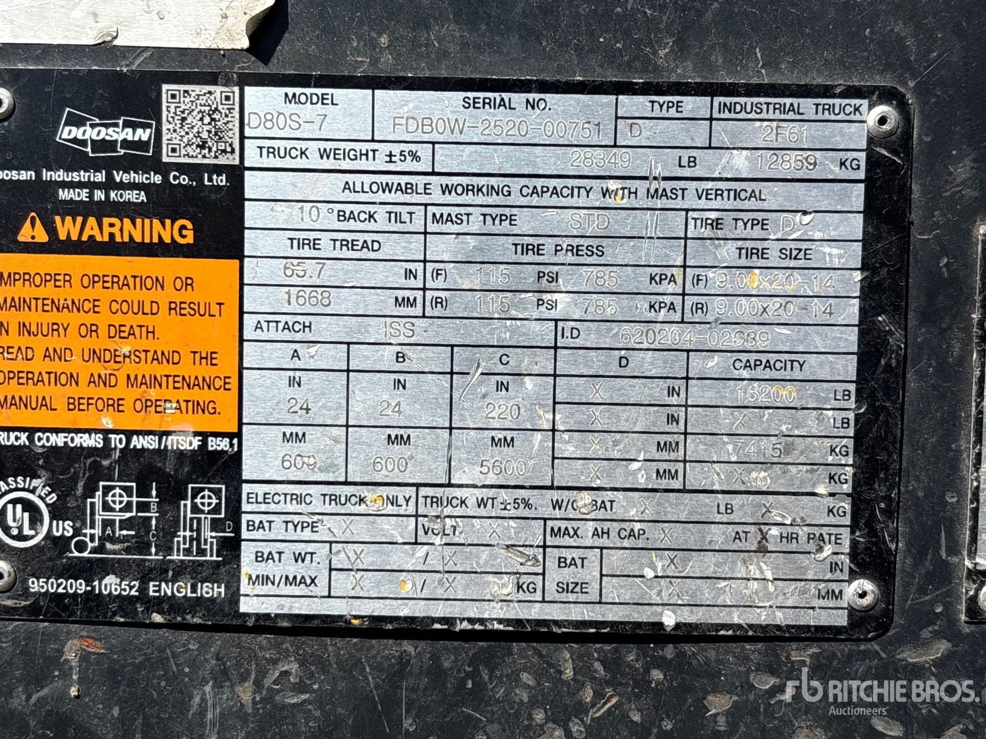 The detailed equipment information is limited in scope, and Ritchie Bros. Auctioneers has not inspected any aspects or components of the equipment other than those expressly set forth herein. Unless expressly stated, we make no representations or warranties, express or implied, concerning the equipment or its components, including without limitation any representations or warranties concerning functionality, conformity or compliance with any safety standard or requirement of any applicable authority or regulatory body, fitness for any particular purpose, or merchantability. You are strongly advised to perform your own detailed inspection of the equipment prior to bidding.