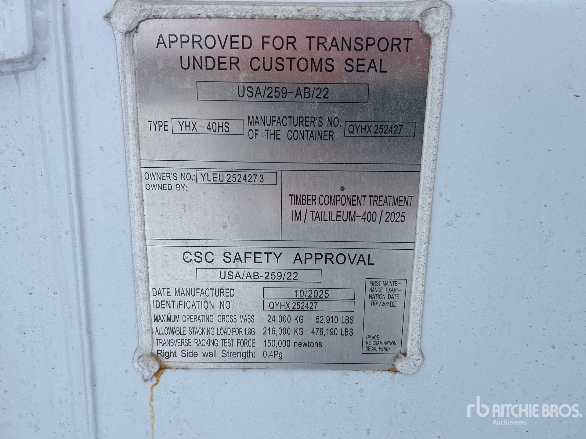 A qualified Ritchie Bros. employee collected detailed equipment information and performed functional tests on the key components of this asset. You, or a proxy, may also inspect any items on site prior to bidding on auction day.