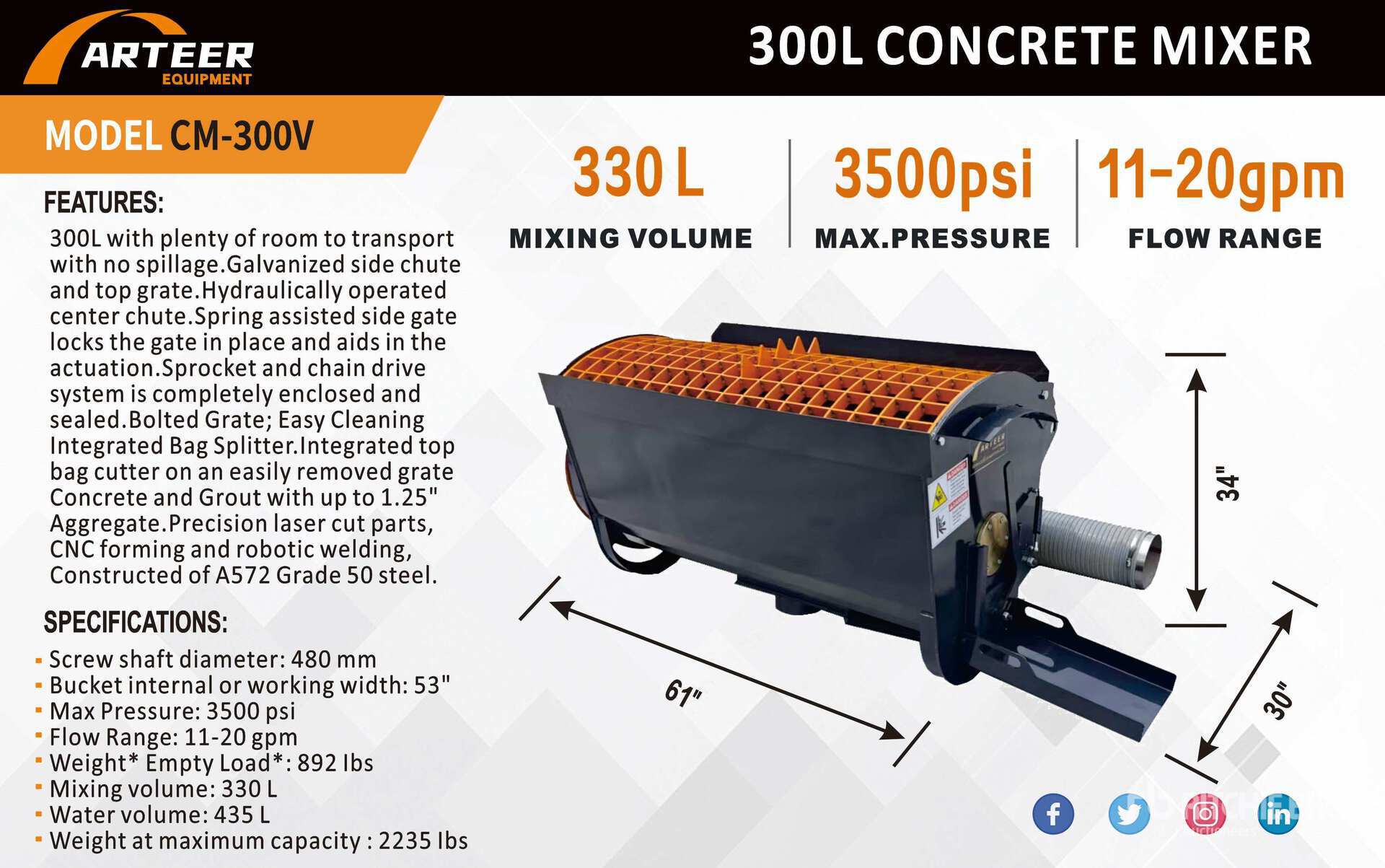 2025 ARTEER CM-300V Skid Steer Concrete Mixer (Unused)