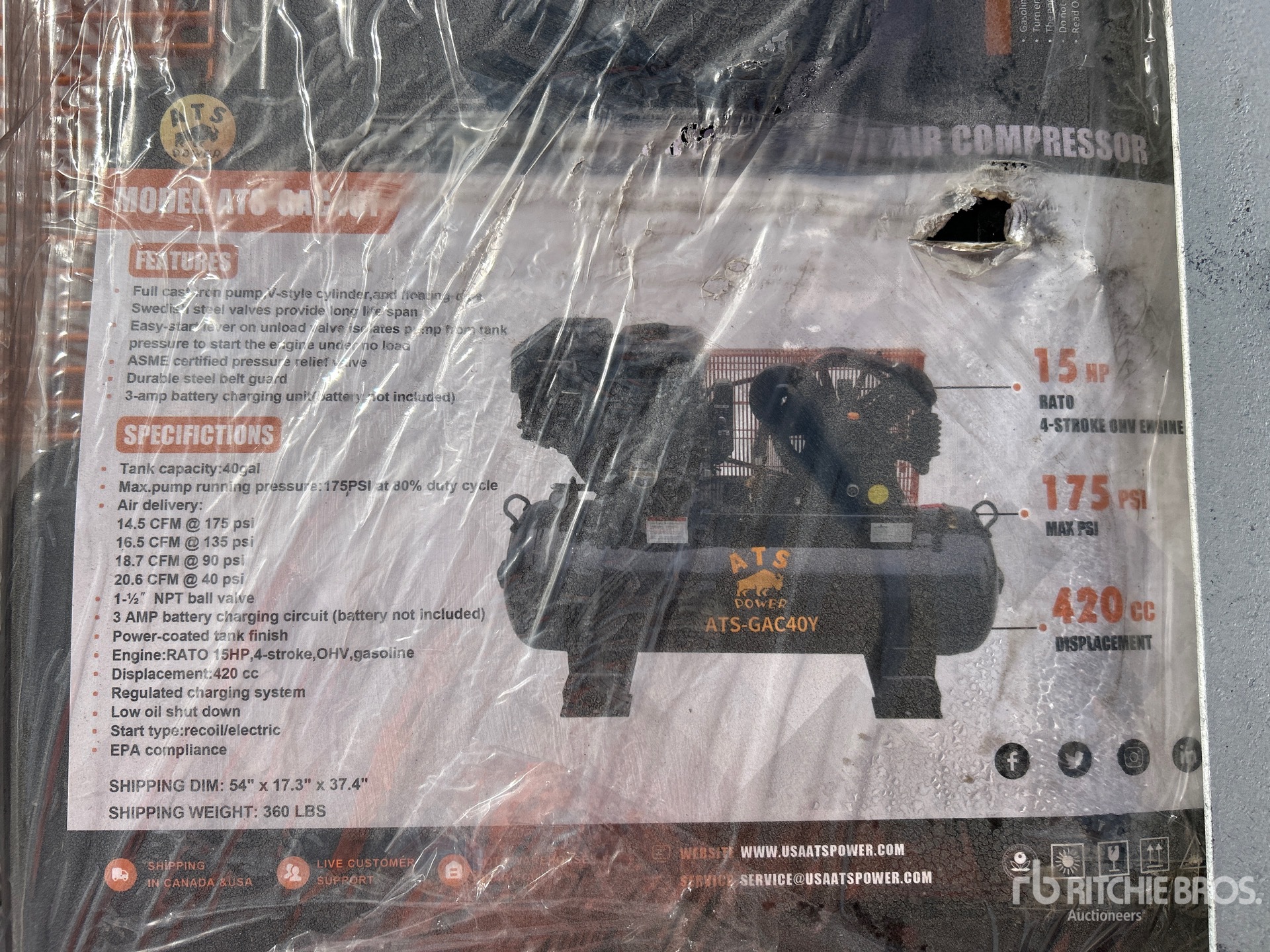 175 psi Working Pressure, 1 Cylinder 15 hp 420 cc Gasoline Engine