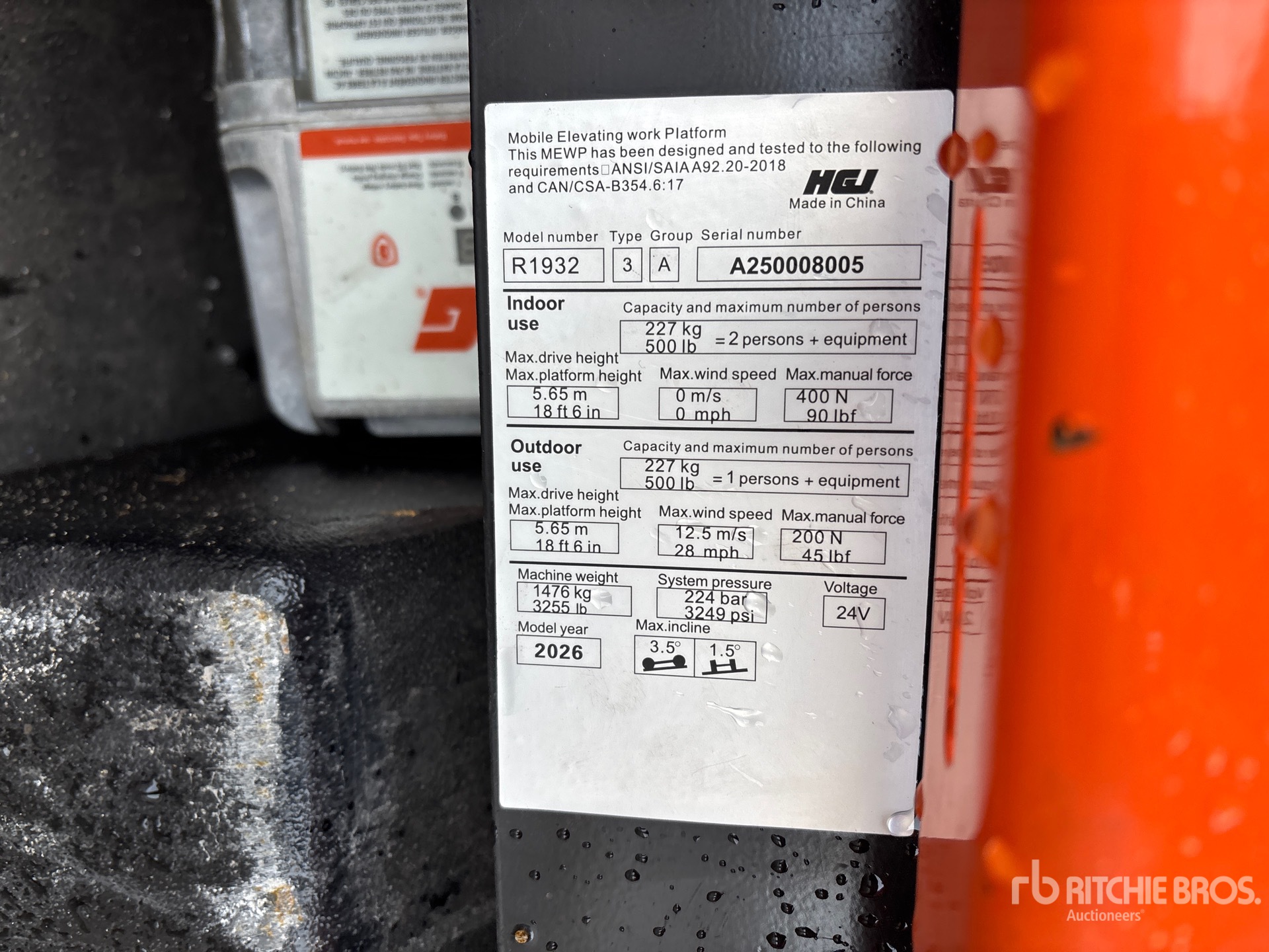 The detailed equipment information is limited in scope, and Ritchie Bros. Auctioneers has not inspected any aspects or components of the equipment other than those expressly set forth herein. Unless expressly stated, we make no representations or warranties, express or implied, concerning the equipment or its components, including without limitation any representations or warranties concerning functionality, conformity or compliance with any safety standard or requirement of any applicable authority or regulatory body, fitness for any particular purpose, or merchantability. You are strongly advised to perform your own detailed inspection of the equipment prior to bidding.