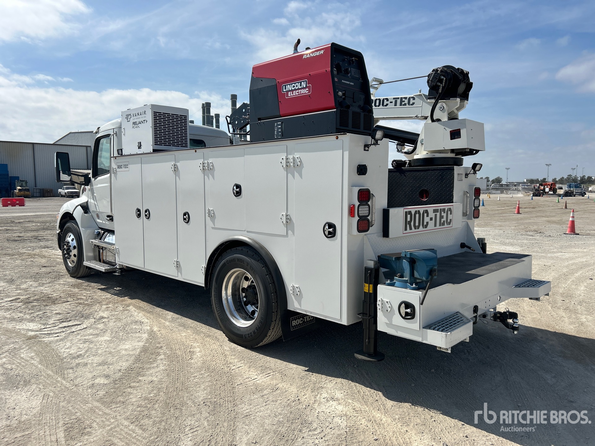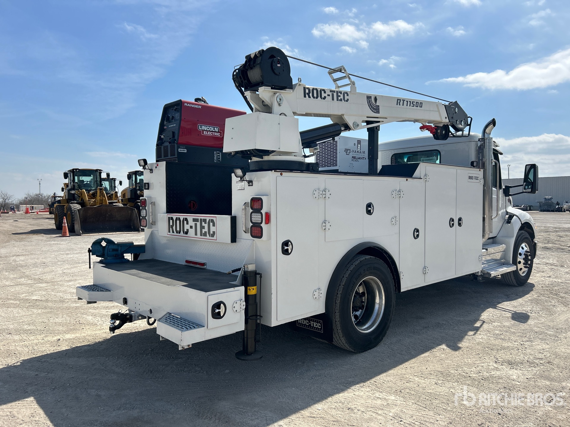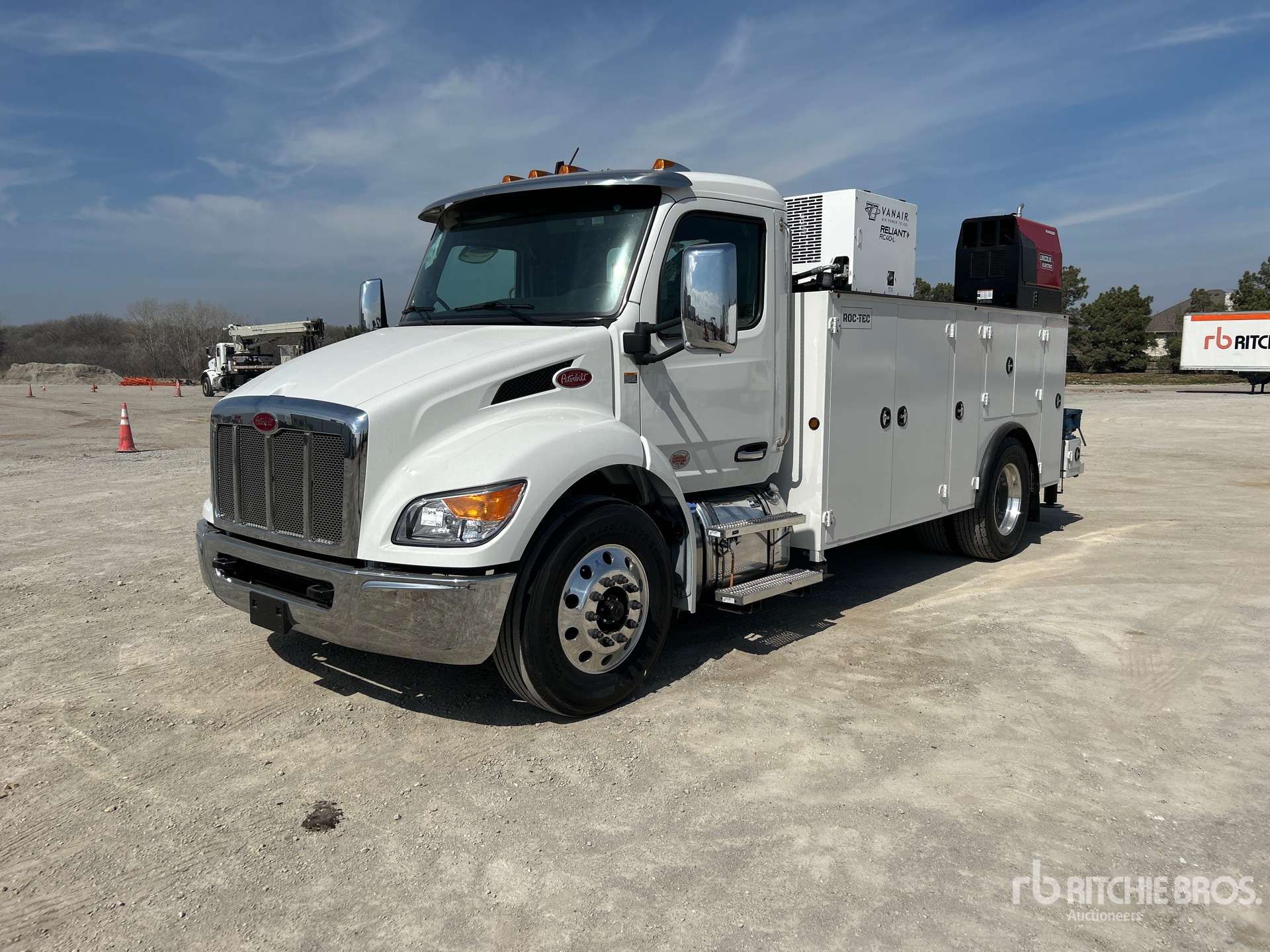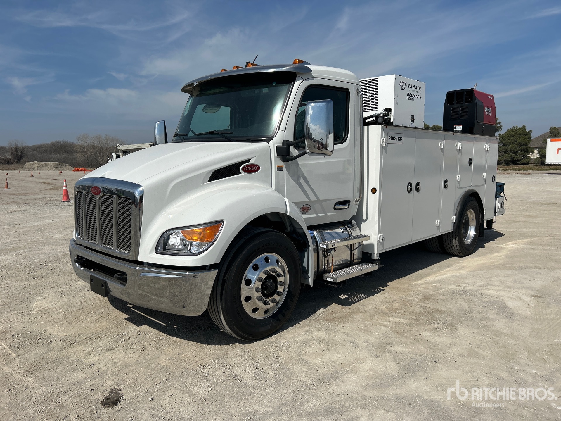 Paccar PX-7 6 Cylinder 6.7 L Diesel 260 hp Engine, 2025 US EPA Label, Requires Diesel Exhaust Fluid, 11.4 Engine hrs, Engine Brake, Allison 2500 Automatic Transmission, 10000 lb Front Axle, 18000 lb Rears, Meritor Drive Axles, 5.29:1 Axle Ratio, 26000 lb GVWR, Air Ride Cab, Aluminum Wheels, 295/75R22.5, Air Ride Suspension, 187 in Wheelbase, PTO, ROC-TEC 16 ft 6 in Body, Hydraulic Stabilizers, 2025 ROC-TEC RT11500 12125 lb 2 Section Hydraulic Crane, Wireless Remote Control, Lincoln Ranger Gasoline Generator Set, Vanair RC-40L Hydraulic Air Compressor, Air Hose Reel, Lincoln Ranger Gasoline Welder